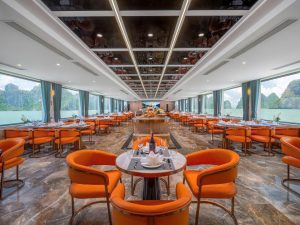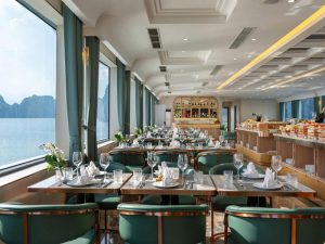 Trên hành trình Leona Cruises Hạ Long trong ngày, du khách được thưởng thức bữa trưa cao cấp trong không gian nhà hàng sang trọng, thiết kế hiện đại với tầm nhìn toàn cảnh Vịnh Hạ Long. Thực đơn được chế biến bởi đầu bếp chuyên nghiệp, kết hợp hài hòa giữa hải sản tươi sống, món Á – Âu tinh tế và đặc sản địa phương, đáp ứng đa dạng khẩu vị. Trải nghiệm ẩm thực trên du thuyền Leona Cruises không chỉ là bữa ăn, mà còn là điểm nhấn nâng tầm hành trình tham quan vịnh trong ngày.