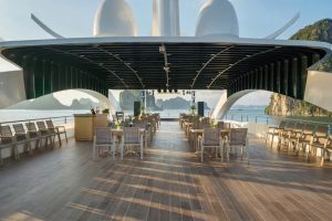 Trải nghiệm ăn ngoài trời: Thưởng thức bữa tối dưới ánh hoàng hôn trên boong tàu với không gian lãng mạn.